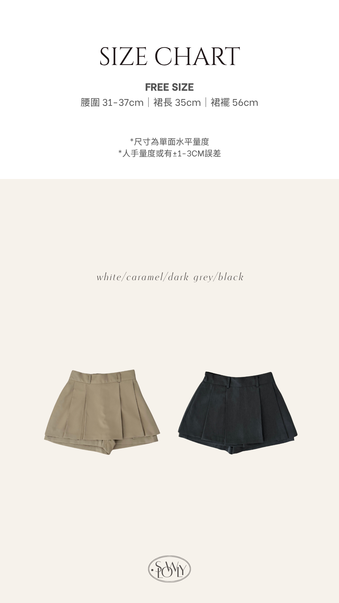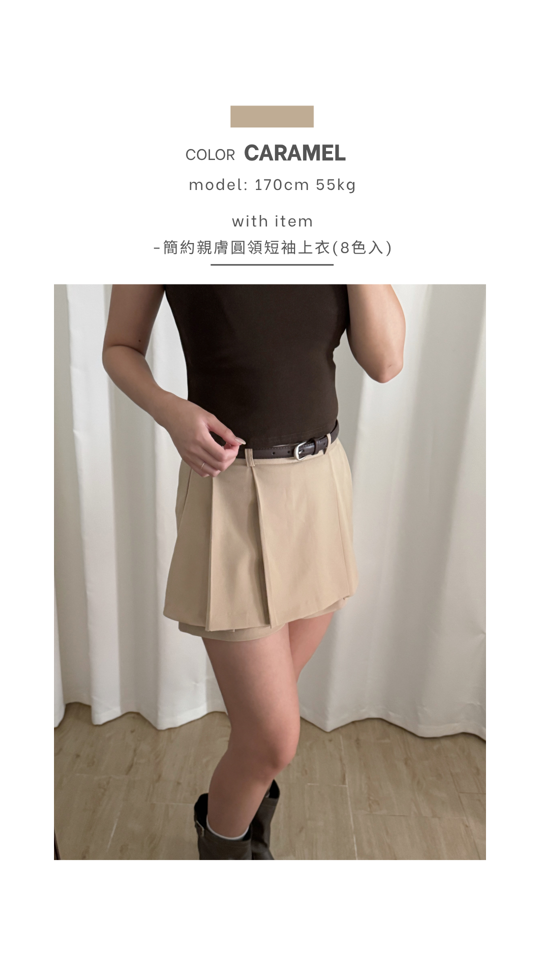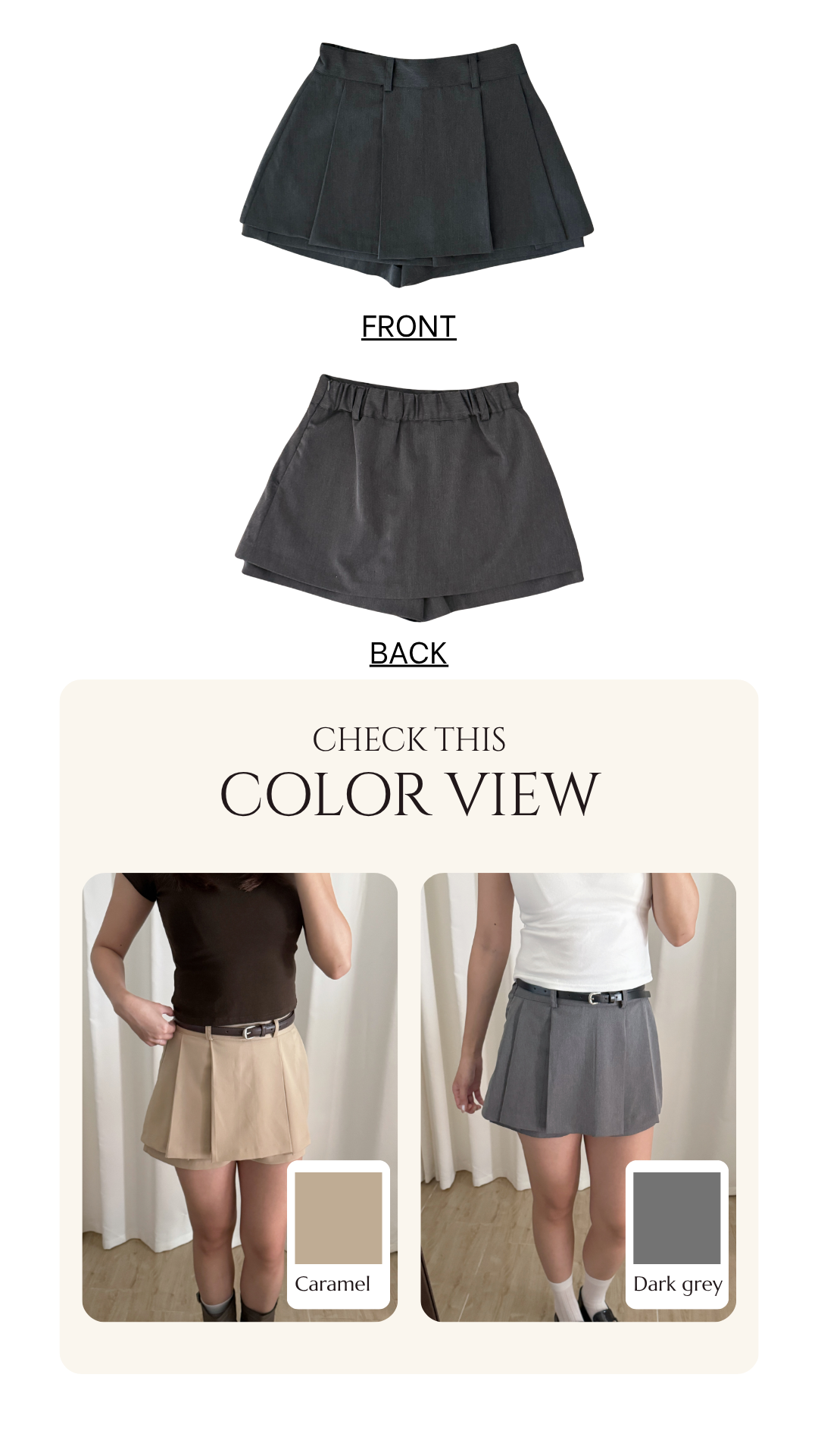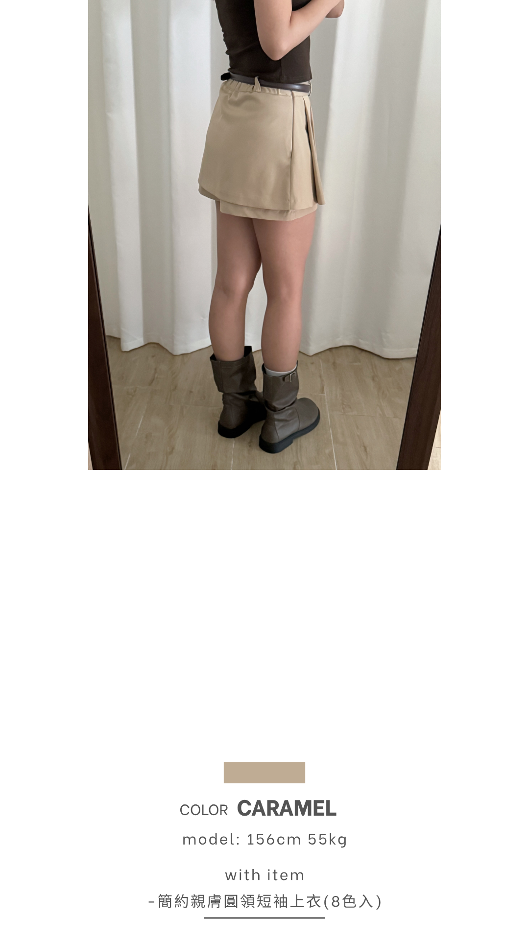 壓褶設計+露褲設計=時尚感upup!✨ 絕對係一條四季百搭的短裙款ദ്ദി /半橡筋腰設計 /前面為壓褶 後面為普通裙型 /露褲設計 穿着更安心 顯腿瘦 /側面有拉鍊開合 Slowly’s pick: caramel>dark grey>white>black