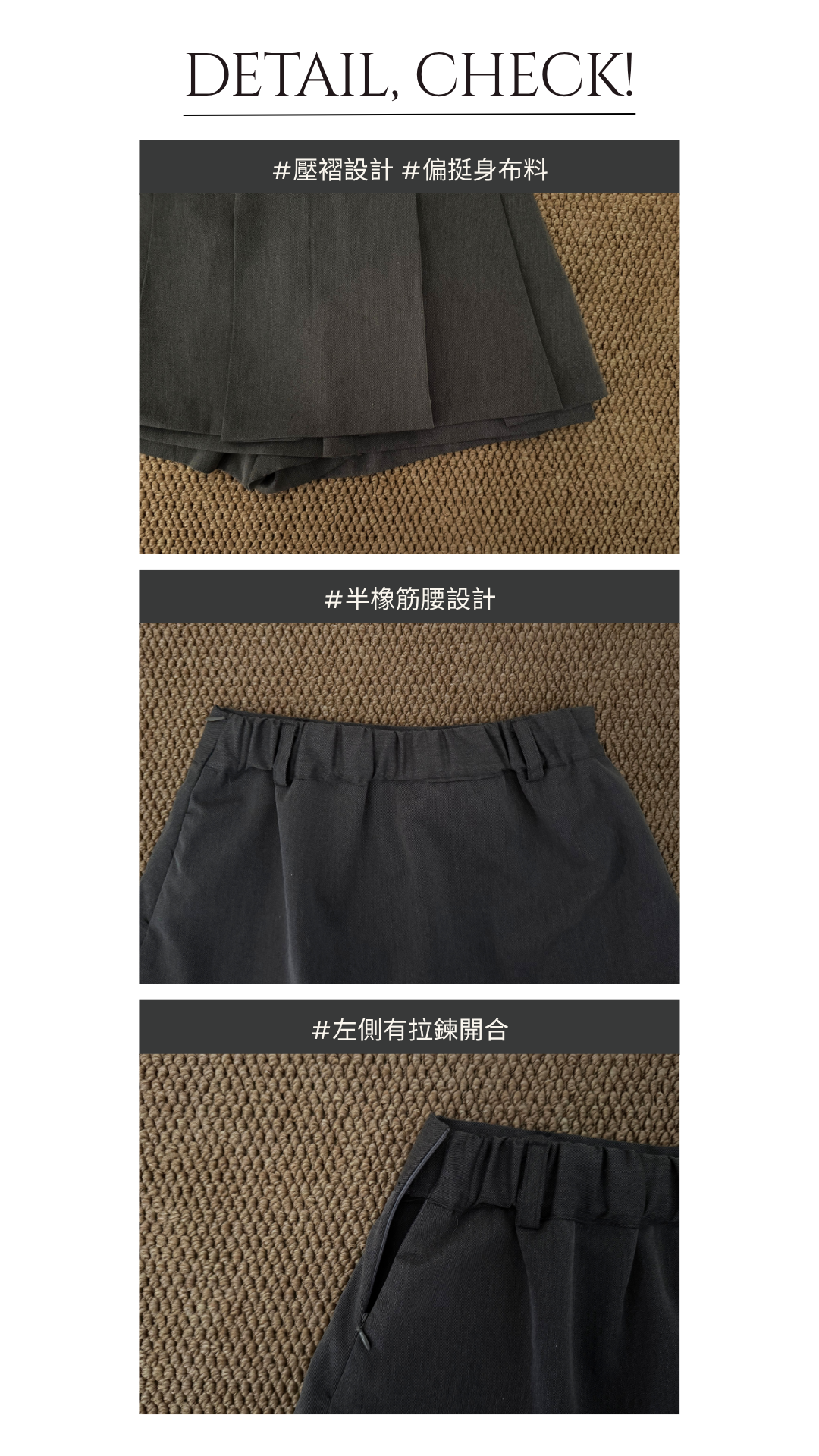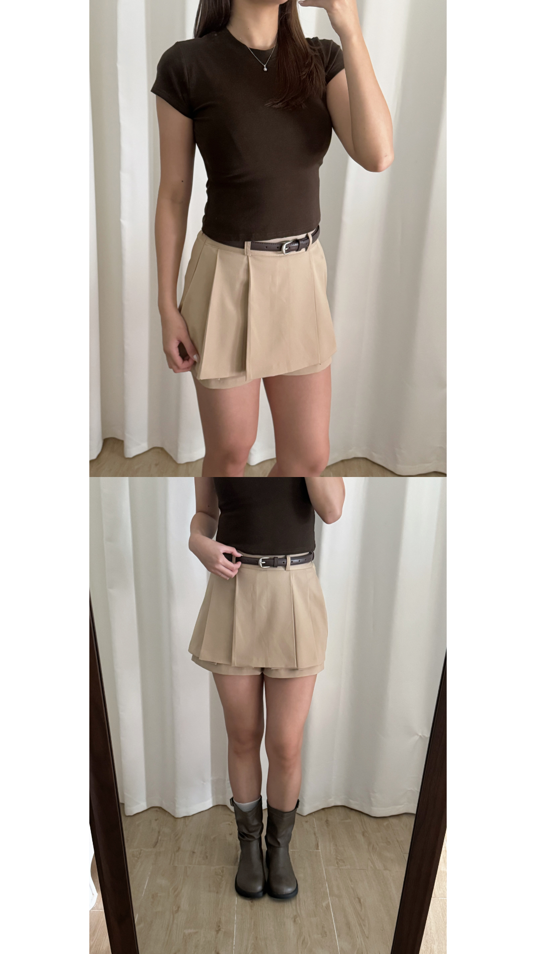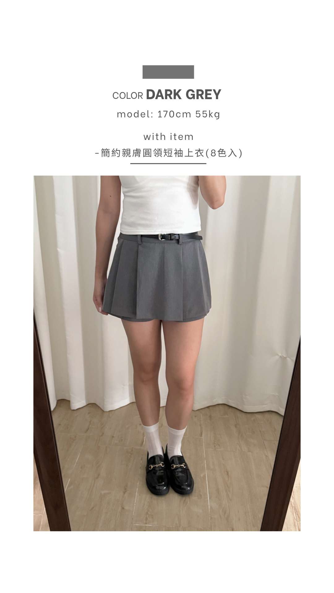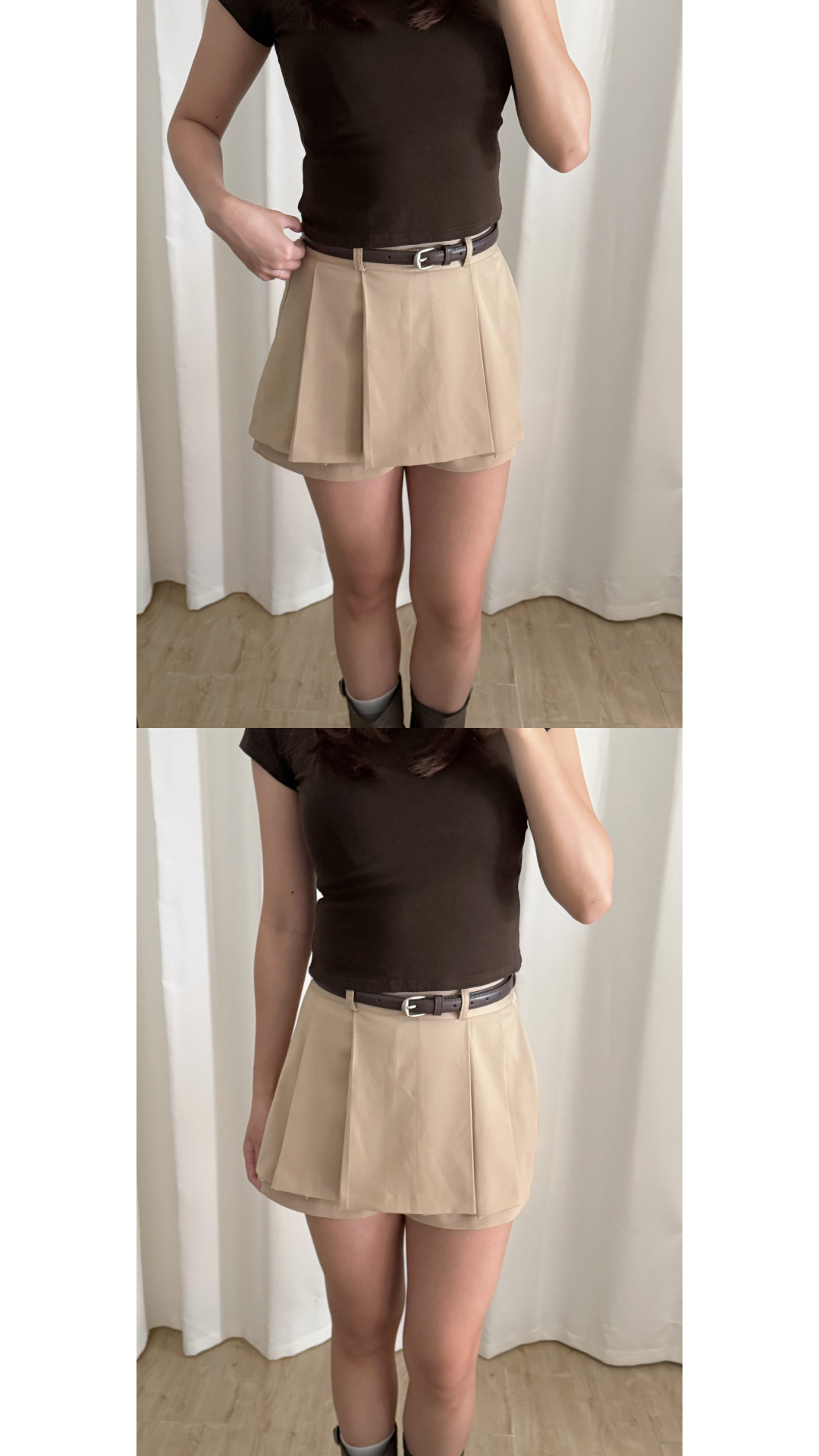 壓褶設計+露褲設計=時尚感upup!✨ 絕對係一條四季百搭的短裙款ദ്ദി /半橡筋腰設計 /前面為壓褶 後面為普通裙型 /露褲設計 穿着更安心 顯腿瘦 /側面有拉鍊開合 Slowly’s pick: caramel>dark grey>white>black