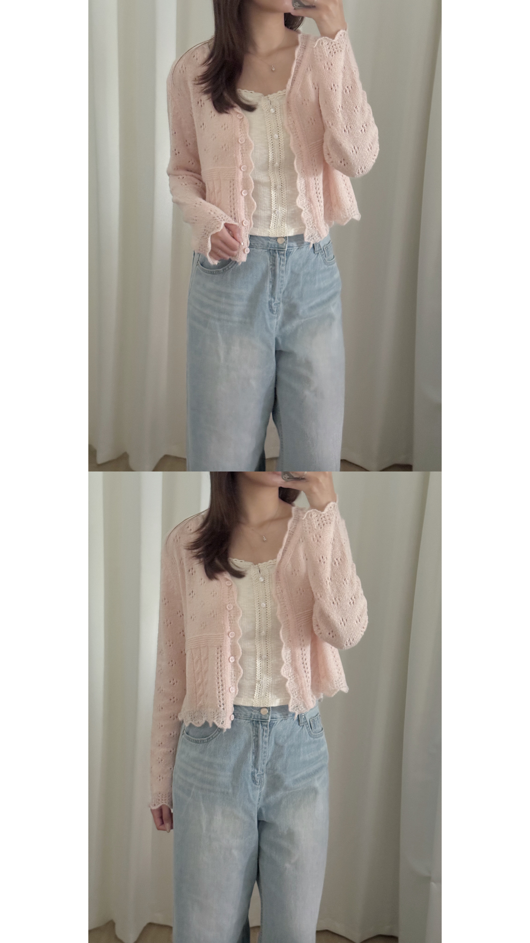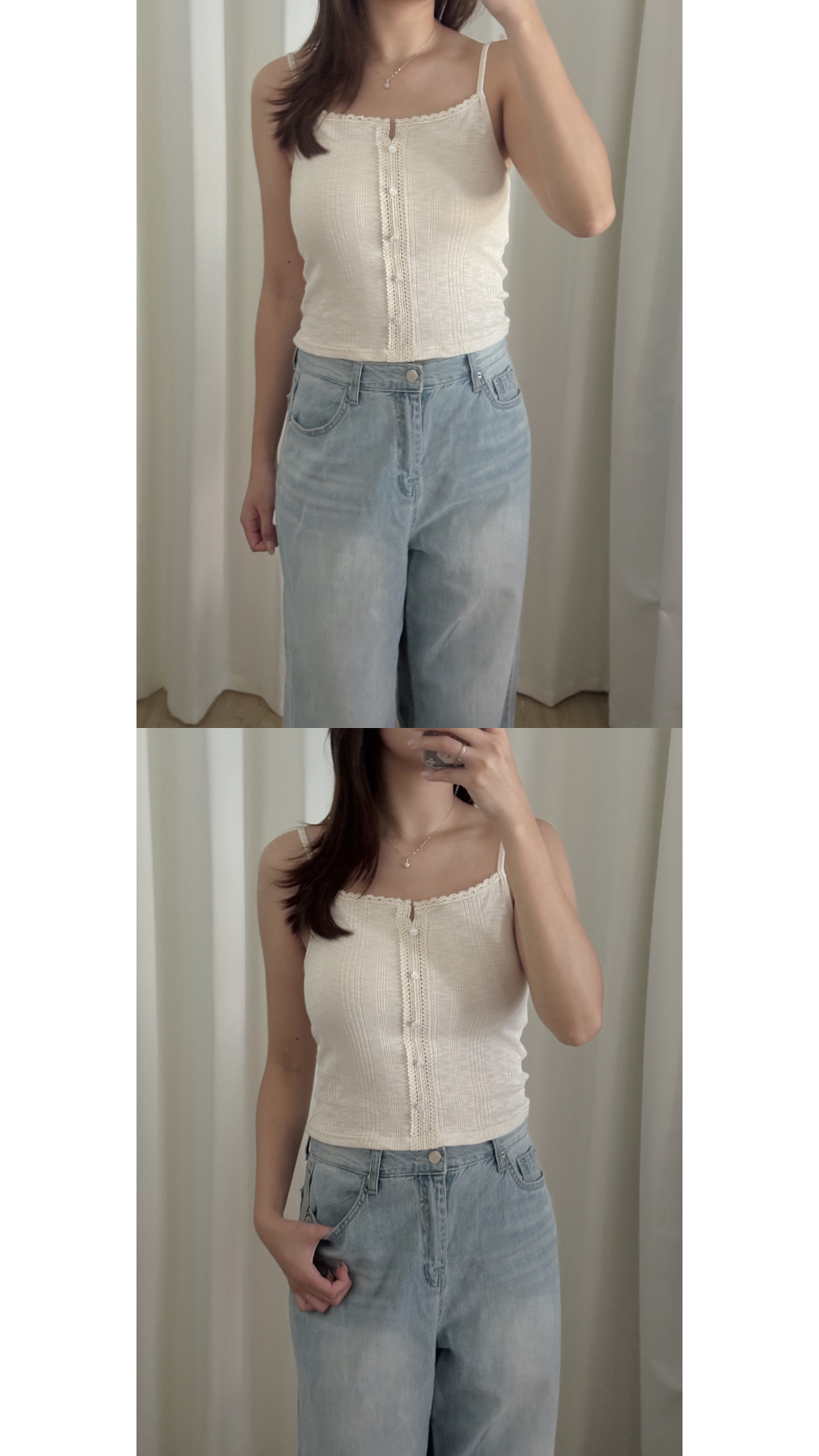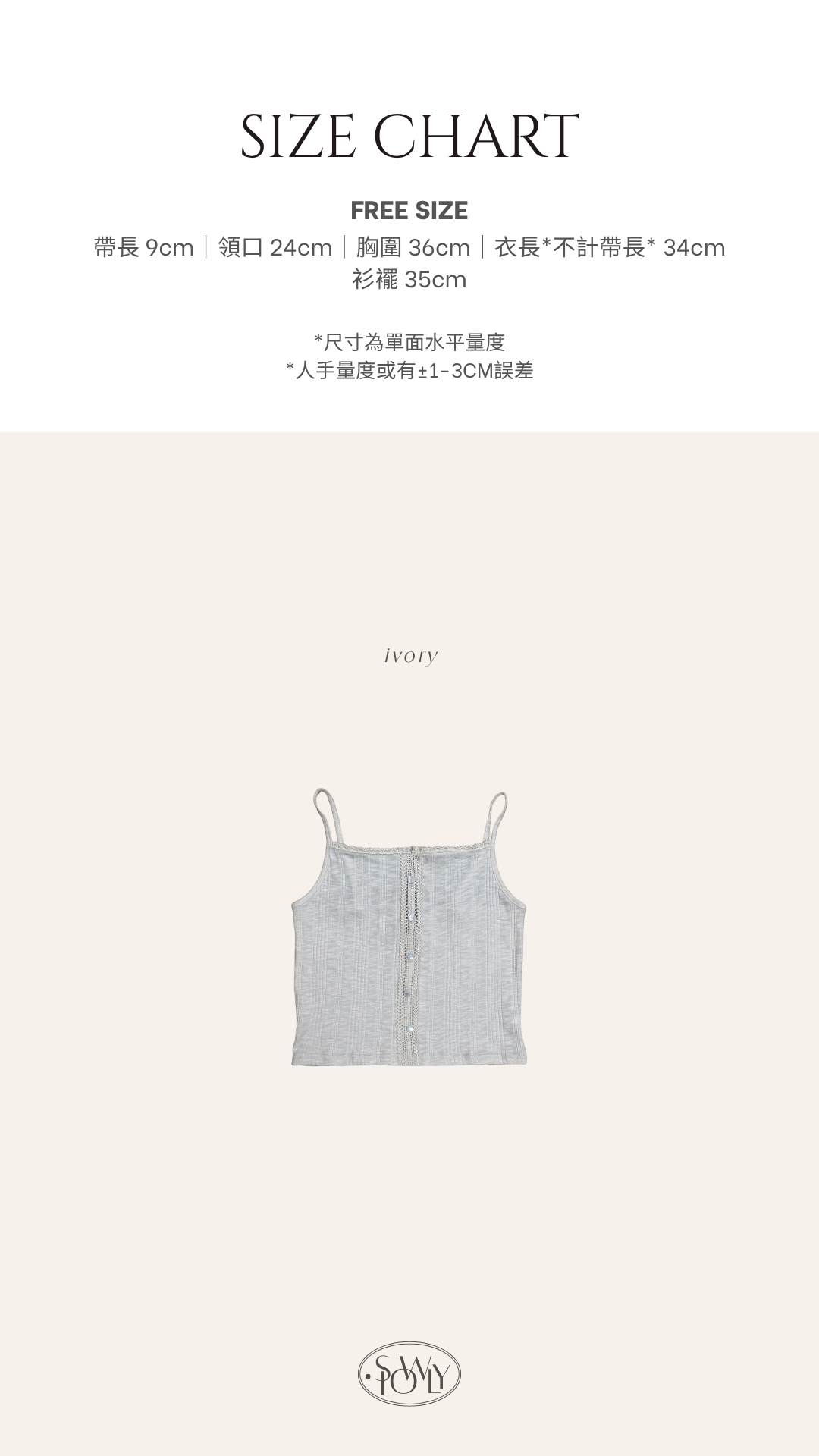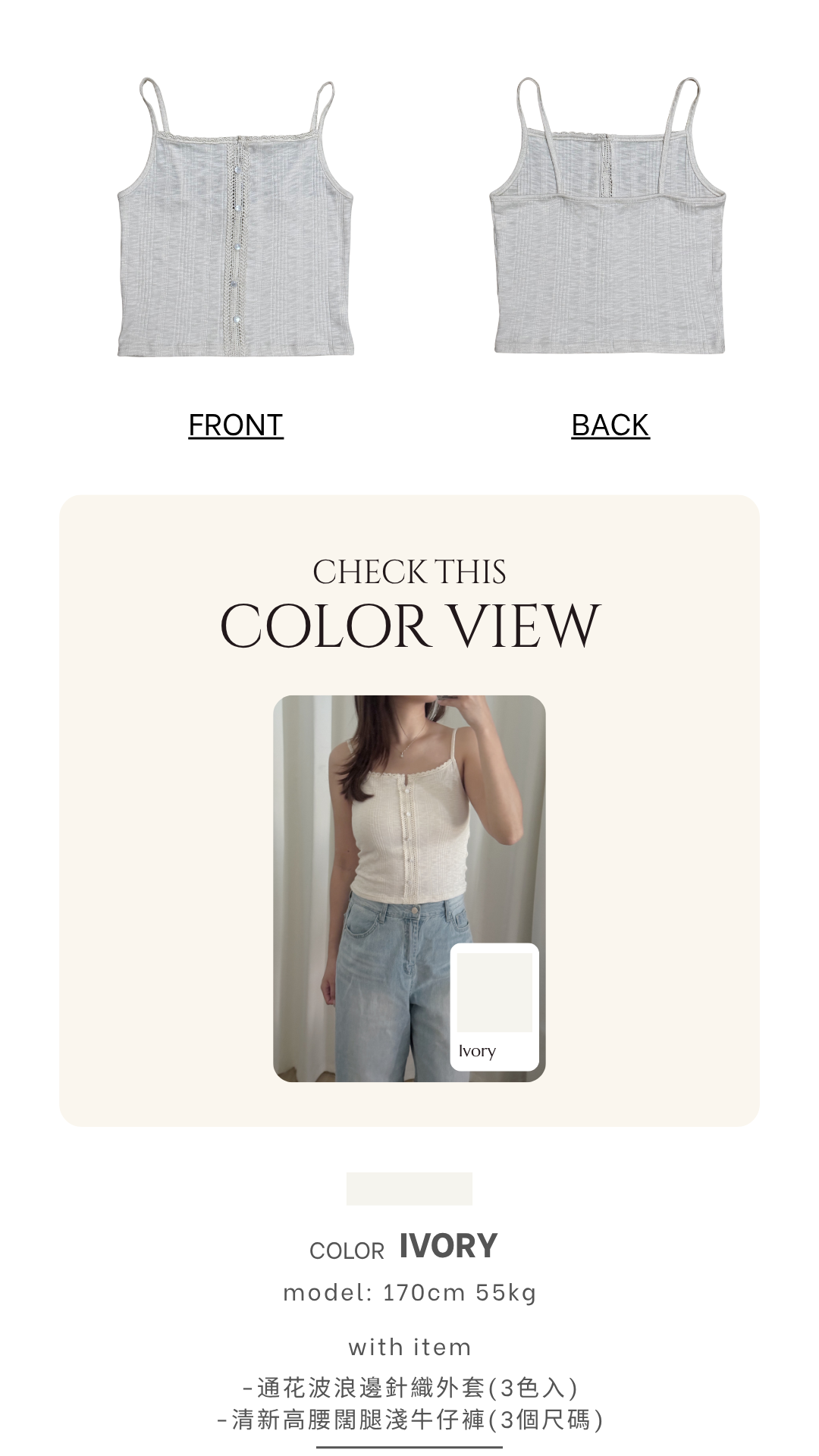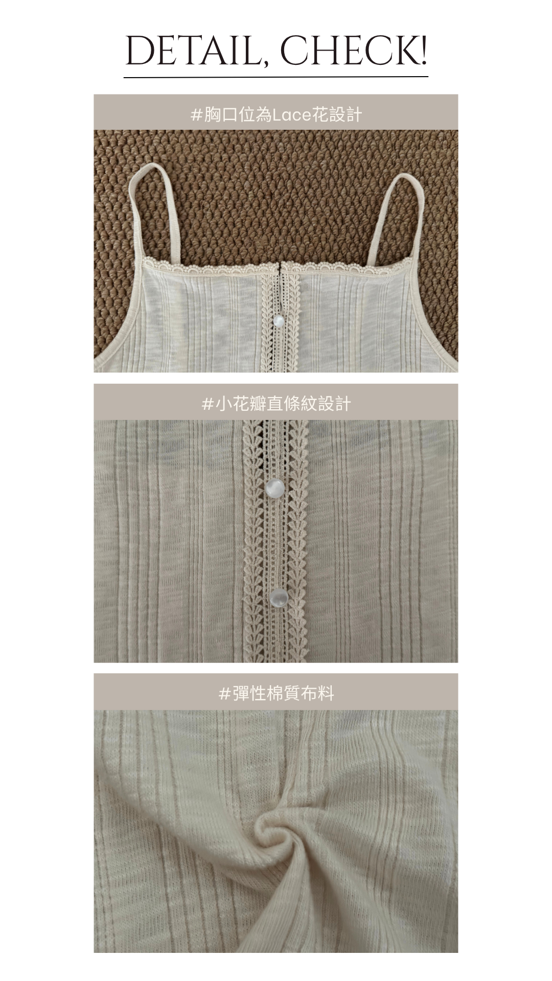 特別花紋小背心款 領口位為lace花紋設計 背心中間為直條花邊設計 近睇會見到小花瓣編織成一條! 立體感滿滿喔🌿 *小背心沒有內附胸墊喔