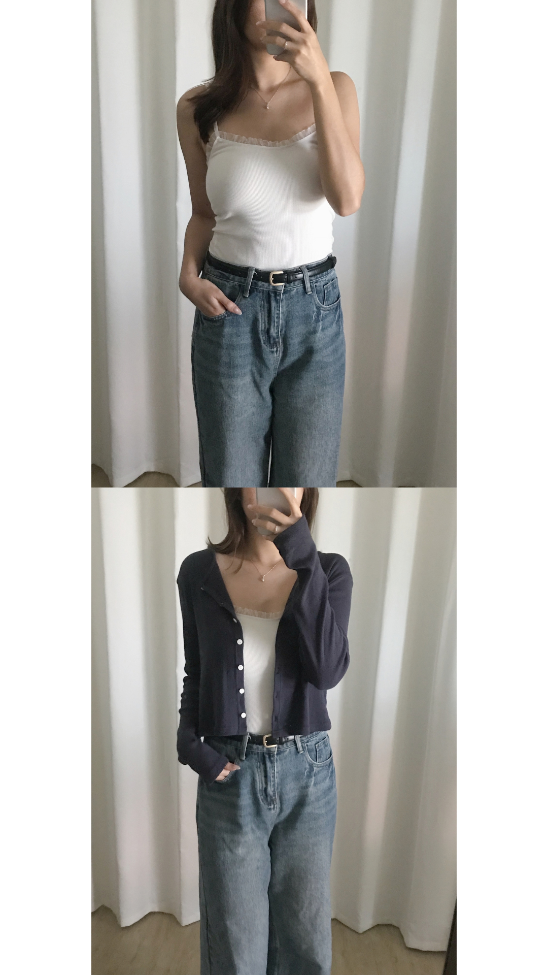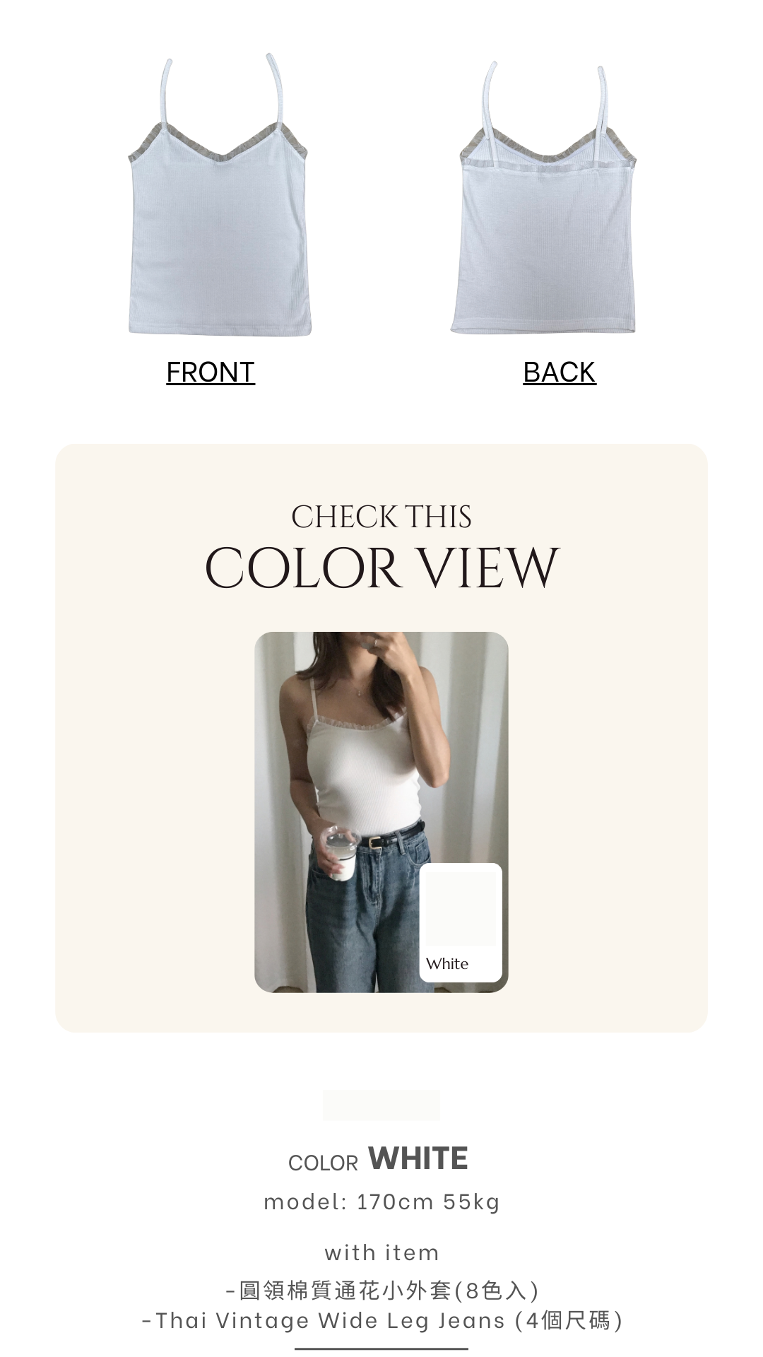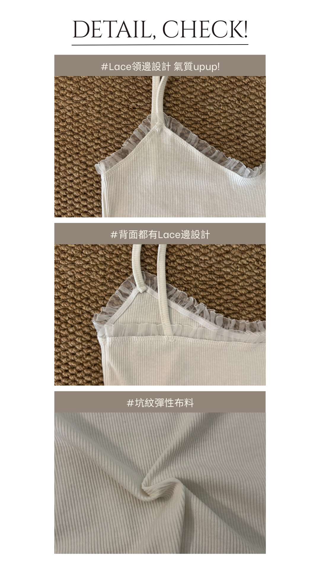 新款小背心🤍 簡單又有亮點位 就係領口位連埋背面都做咗Lace荷葉邊 氣質感upup!✨ 坑紋彈性布料 任何身型都OK! *小背心沒有內附胸墊喔