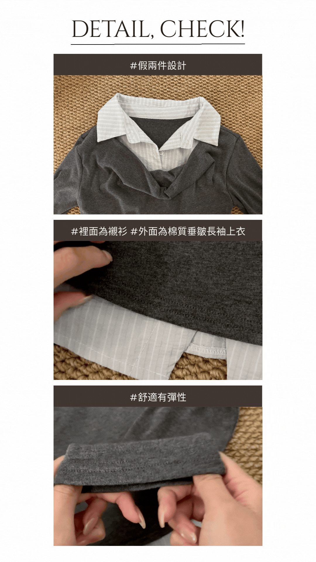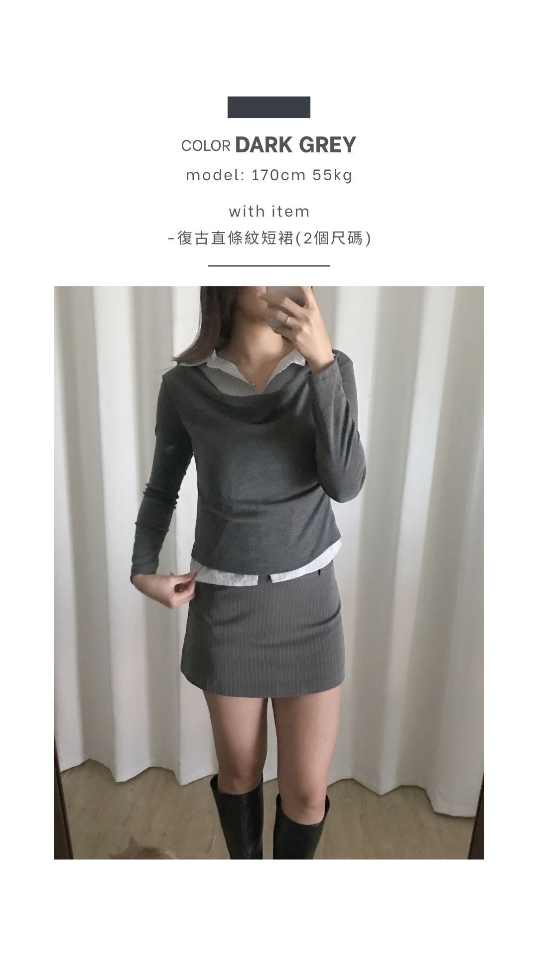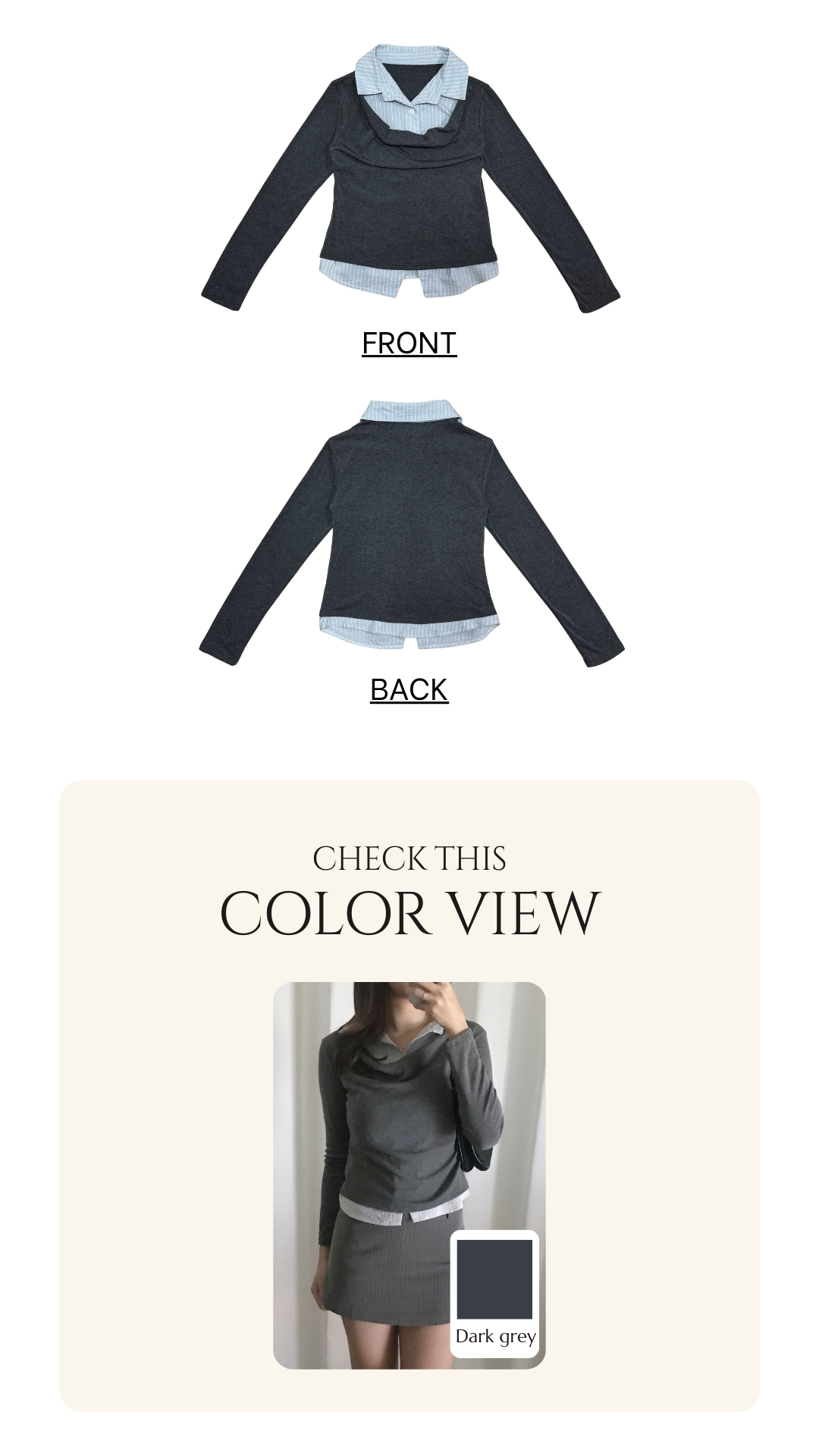 超級韓系嘅假兩件上衣款 裡面係薄薄淺藍色直間襯衫 外面係棉質彈性垂褶設計嘅長袖上衣 深灰色x淺藍色組合好高級 低調氣質感✨ 無論返工還是返學着都一樣適合喔🩶