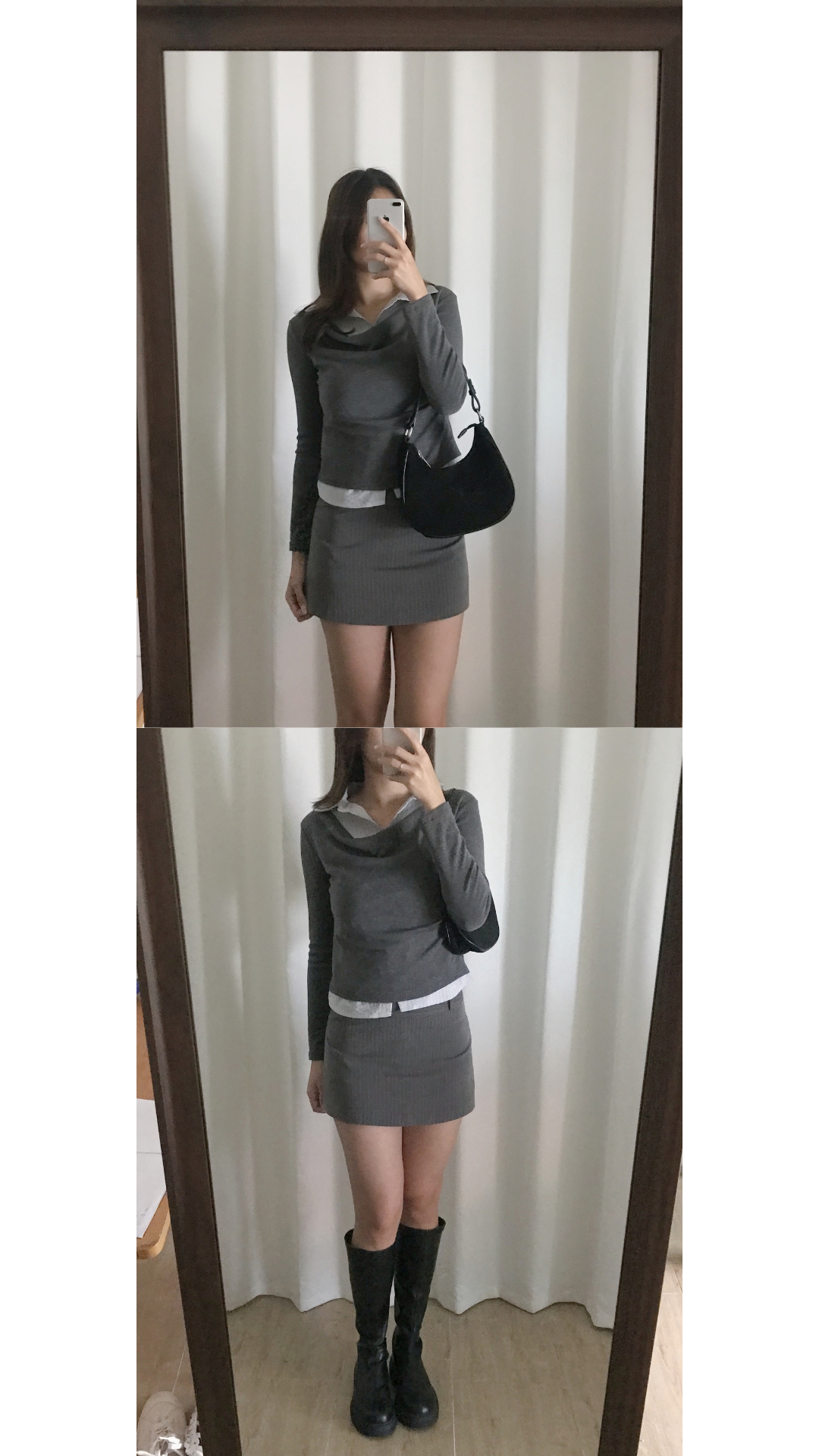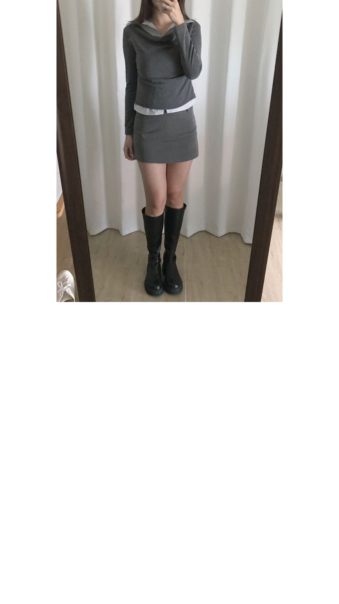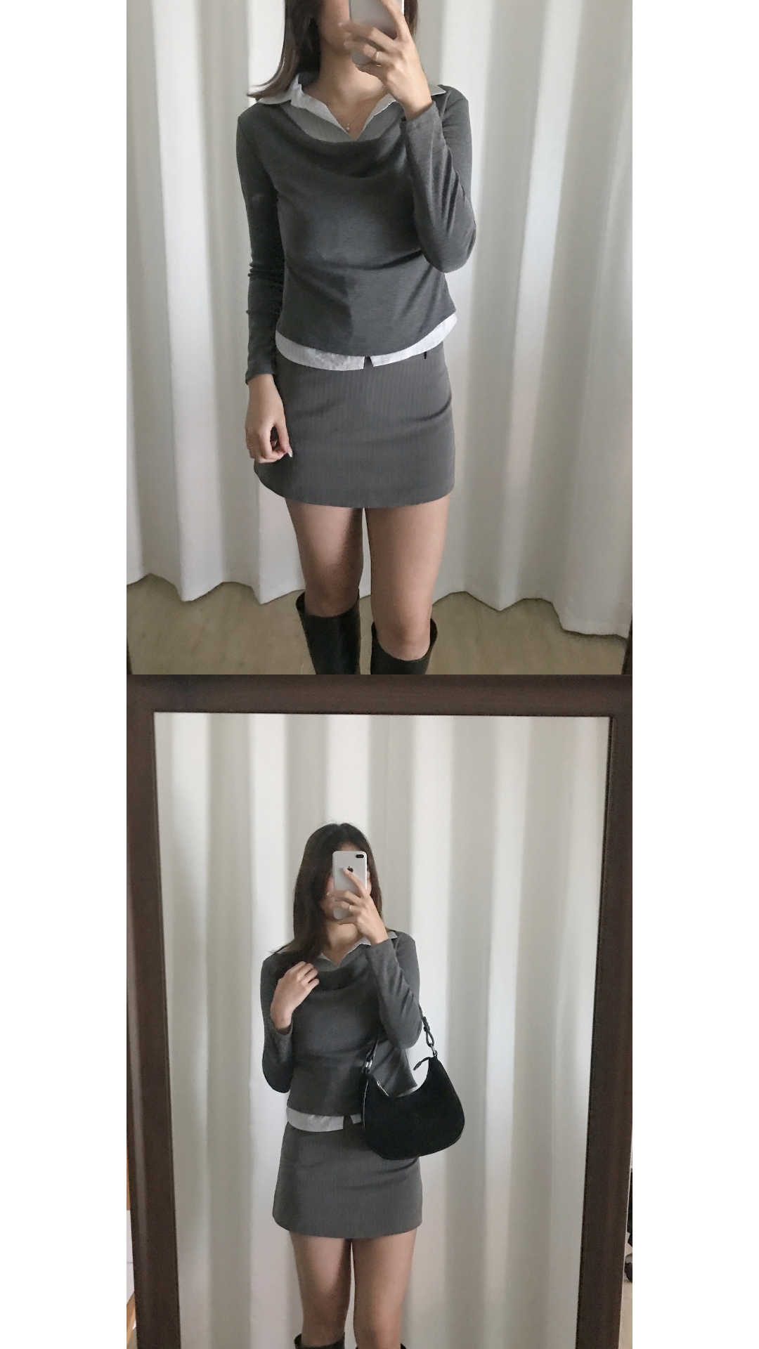 超級韓系嘅假兩件上衣款 裡面係薄薄淺藍色直間襯衫 外面係棉質彈性垂褶設計嘅長袖上衣 深灰色x淺藍色組合好高級 低調氣質感✨ 無論返工還是返學着都一樣適合喔🩶